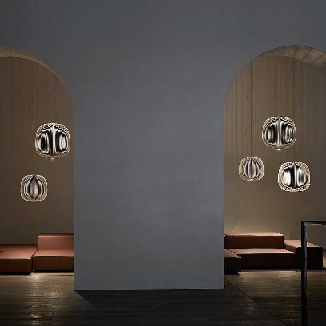 Are you looking for a led suspension lamp and you still don't know Spokes 2?. The hanging lamp Spokes was inspired by images of antique oriental lanterns and less exotic aviaries The designers observed the spokes of a bicycle wheel and this is what gave the lamp its name The result is soft shapes and a lightweight lamp which holds the light allowing it to filter out into the room. The scenographic lightness of Spokes is on display at Foscarini Spazio Monforte A new setup designed by Ferruccio Laviani underlines the versatility and breadth of the Spokes range, which is now enriched with new shapes, sizes and colors.