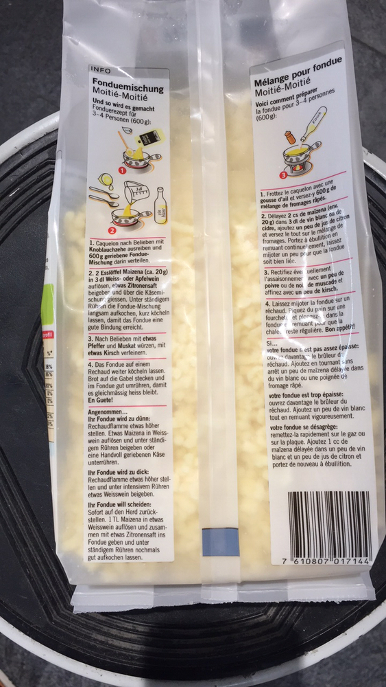 My favorite fondue is called the "moitiemoitie", or literally half and half It is half gruyere and half vacherin fribourgeois The latter is hard to find in the US but my local coop stocks it in the winter (online is also possible) You can substitute fontina or use emmenteler for another classic fondue. Sehr entäuscht waren wir vom Gerber Fondue, ohne zusätzliche Würze ist es schon fast ungeniessbar Traurig, wenn man bedenkt, dass es das meist gegessene Fondue in der Schweiz ist Ganz klar an der Spitze war das Appenzeller Fondue aus der Käserei Tannenberg (aus dem fromashop) und die Hausmischung aus der Chäsi Grenchen. Rub the inside of the caquelon (fondue pot) with the mashed garlic, add cheeses and mix together with corn starch Place wine in saucepan and bring to a simmer, being careful not to let it come to a boil For seasoning, I like to use the pepper and nutmeg mixes made especially for Fondue, and available at Migro or Coop — just a few shakes.