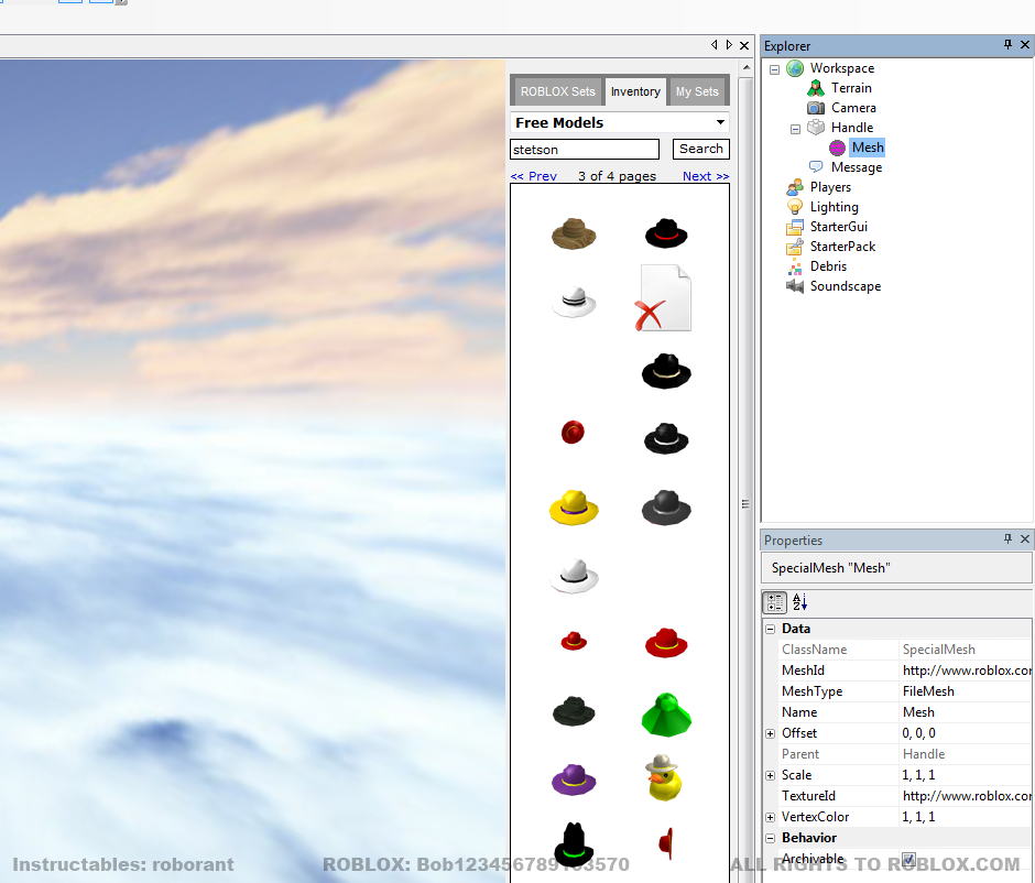 Custom Meshes give ROBLOX developers the opportunity to import detailed 3D models with greater visual fidelity They allow you to break away from the traditional ROBLOX aesthetic and create dynamic shapes and models that would have been incredibly difficult or downright impossible to make otherwise With meshes, developers can begin defining a. Restart Studio when the Plugin is installed 4 Download that exporter_samplerbxl file, there has to be an Brick with an Uzi model put on it, you can browse for meshes for hats or anything in "Search", and then "Free Models", and then replace that uzi with the mesh you got 5. If there is a small game that you remeber that you want to play or something it'll just be spammed words and not related to the thing you search for like what the hell roblox.