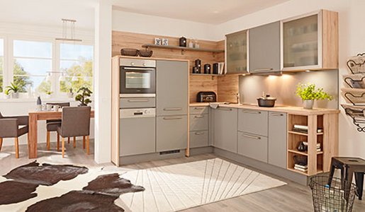 Moderne Landhauskuche Calypso Moderne Grifflose Kuche L Form Grau Eiche Kuchenstudio Mobelhaus A R L E Naturell