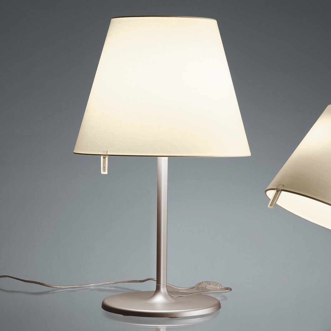Diffuser in silk satin fabric on a plastic frame Base in painted zamac;. Diffuser in silk satin fabric on a plastic frame Melampo Notte Grey. Flexible lamps with a breeze of the good old days – Artemide Melampo One of the most striking strengths of the Artemide Melampo series is the plain, timeless appearance of the table, floor and wall lights This visual advantage of this versatile luminaire family is supplemented by convenient functionality and high quality processing of precious aluminium.