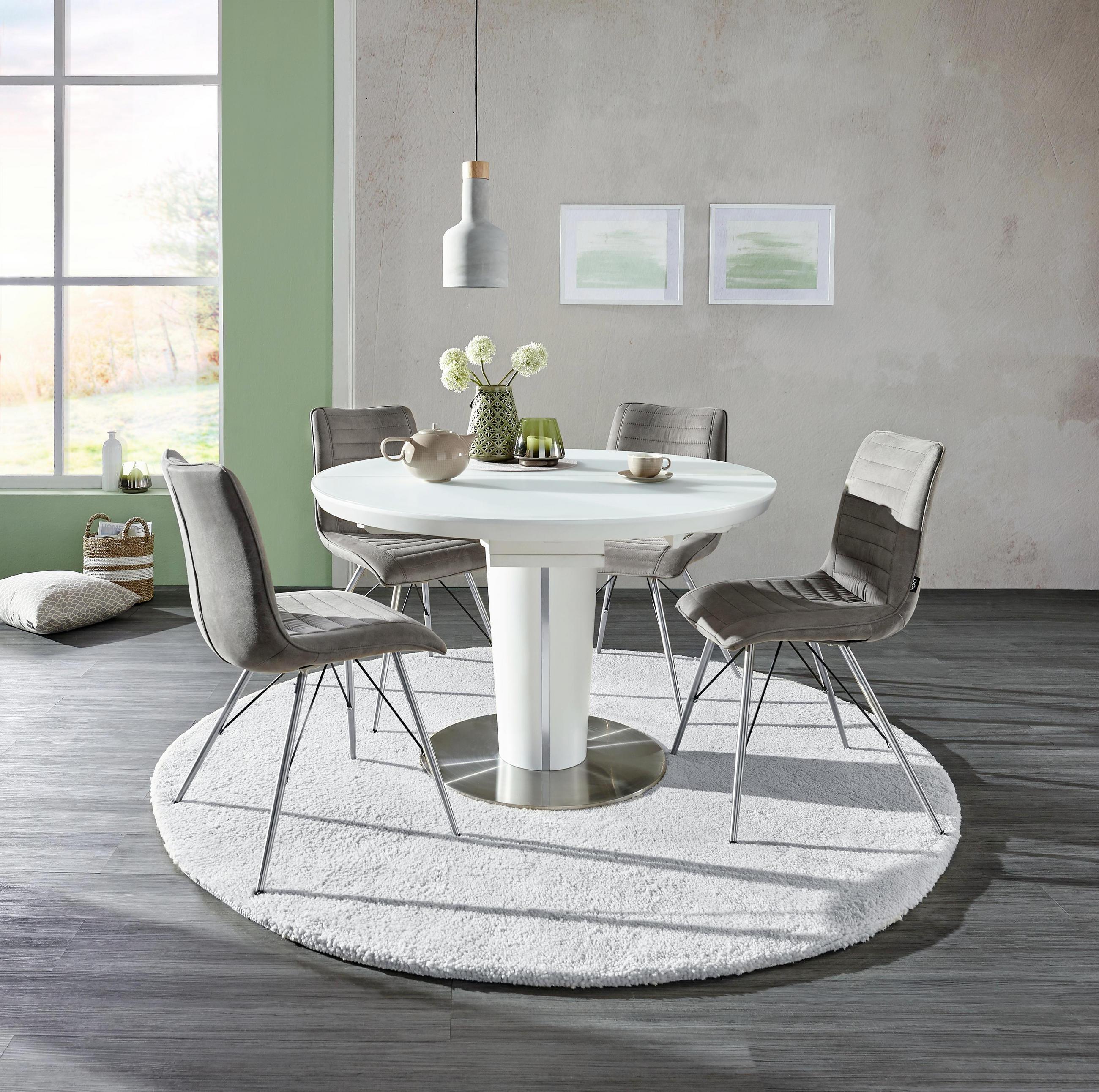 Paket Esszimmertisch Rund 110 Cm Ausziehtisch Tischplatte Anthrazit Modernes Gestell Weiss Matt Greiff